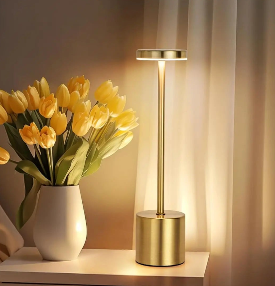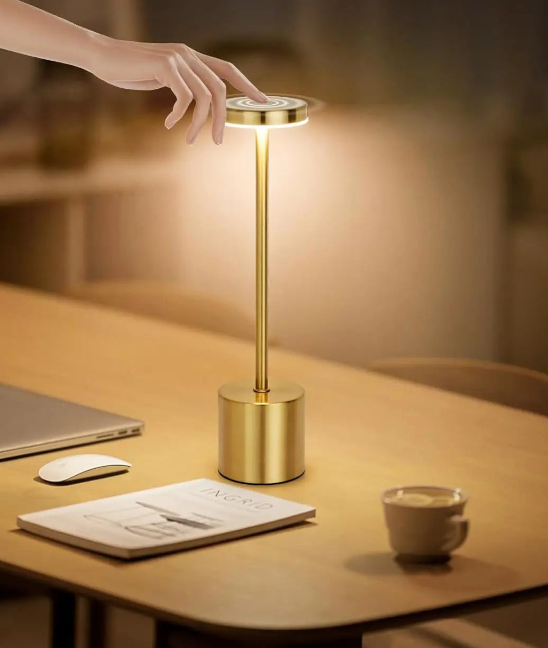 The lamp is cordless and uses a rechargeable lithium-ion battery. This allows flexible placement—use it anywhere in the home (or even outside) without needing to stay plugged in.
